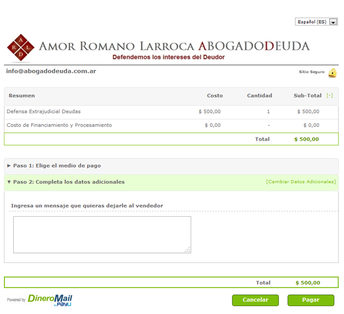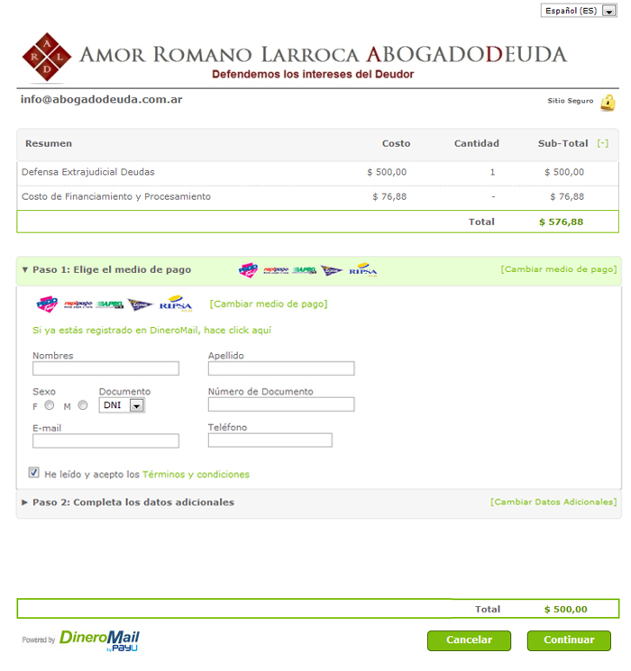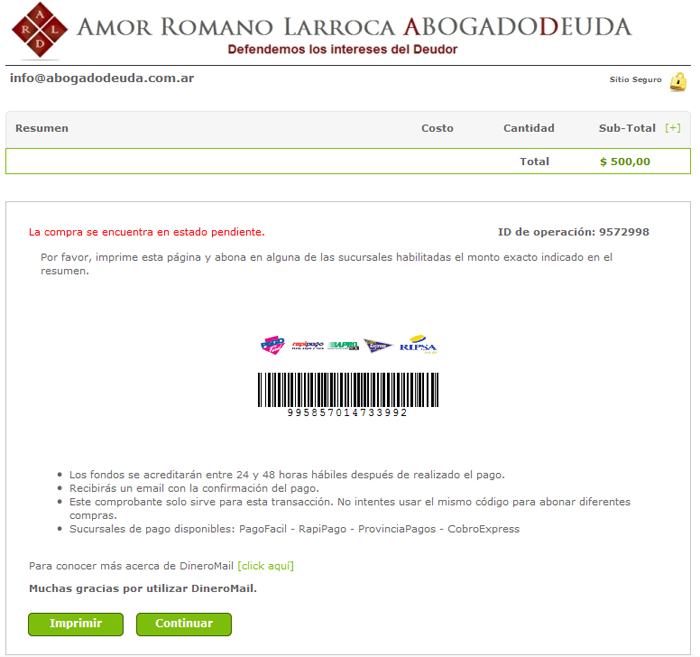 Una vez completado los datos haga click en “Pagar” y luego de que la operación se registre en la baso de datos de DineroMail estará usted listo para completar el procedimiento de pago, imprimiendo el cupón de pago y abonándolo de acuerdo a su comodidad en la red Pago fácil o cualquier otra que usted haya seleccionado.